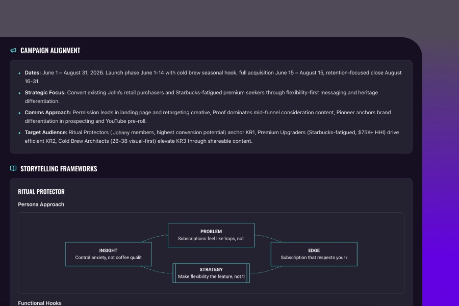 Each document uses proven marketing and media planning frameworks: goal-setting methodologies, persona development models, structured strategy progressions, and media allocation principles. The frameworks are built in, so you get structured outputs without needing to specify a methodology.